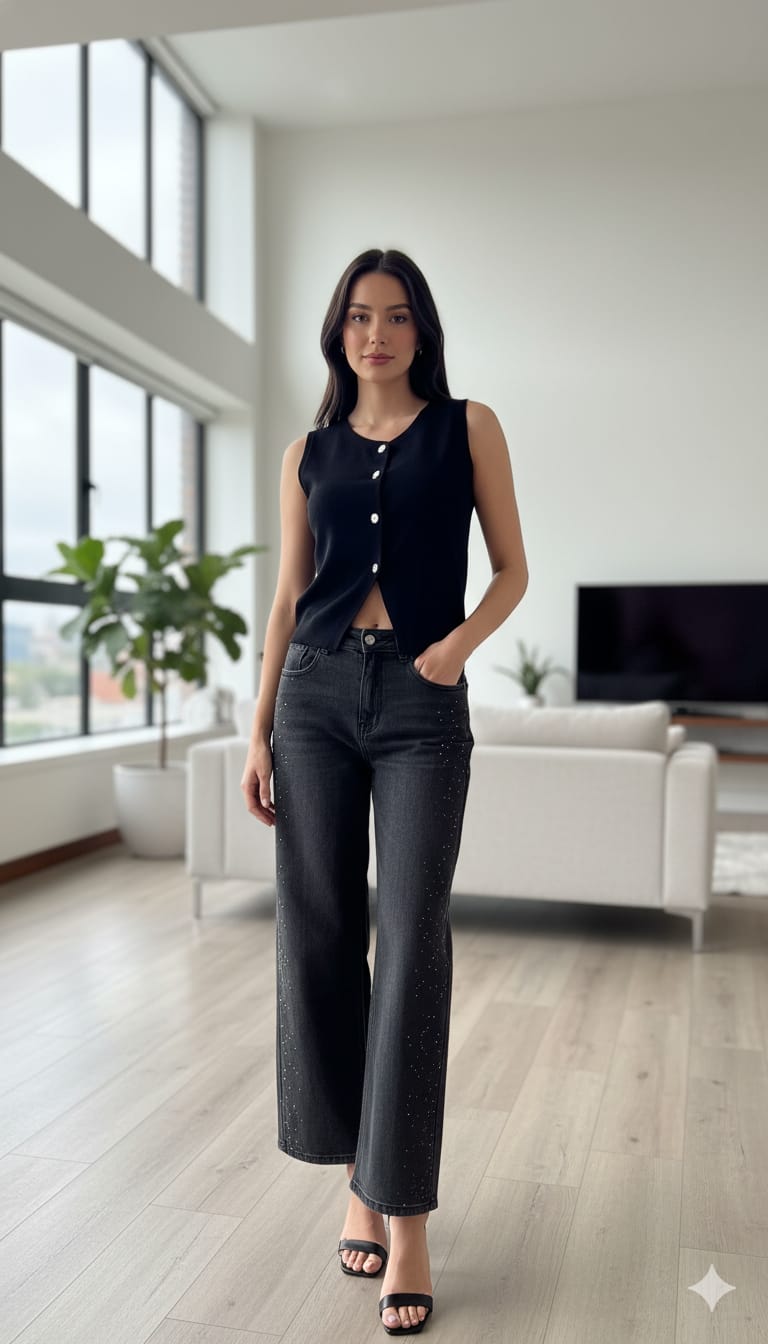 pantalón jeans bota ancha tiro medio con pedrería negro