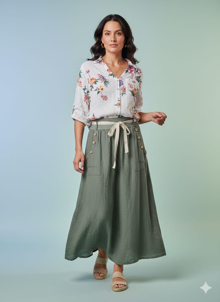 falda lino larga con fajón bolsillos con aplique de botones